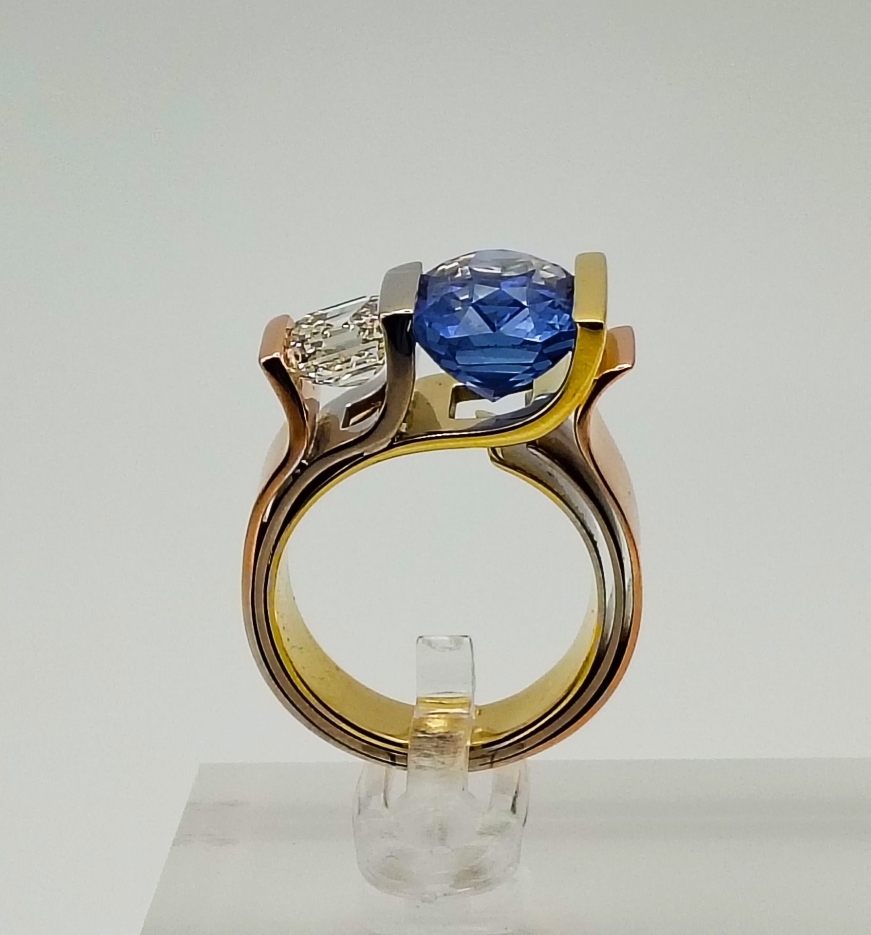 L'azzurro glicine dello zaffiro naturale, del peso di 7,67 carati, richiama il cielo e l'elevazione spirituale, abbracciando la purezza geometrica del diamante in un dialogo che evidenzia il primato dell'anima sui beni mondani.