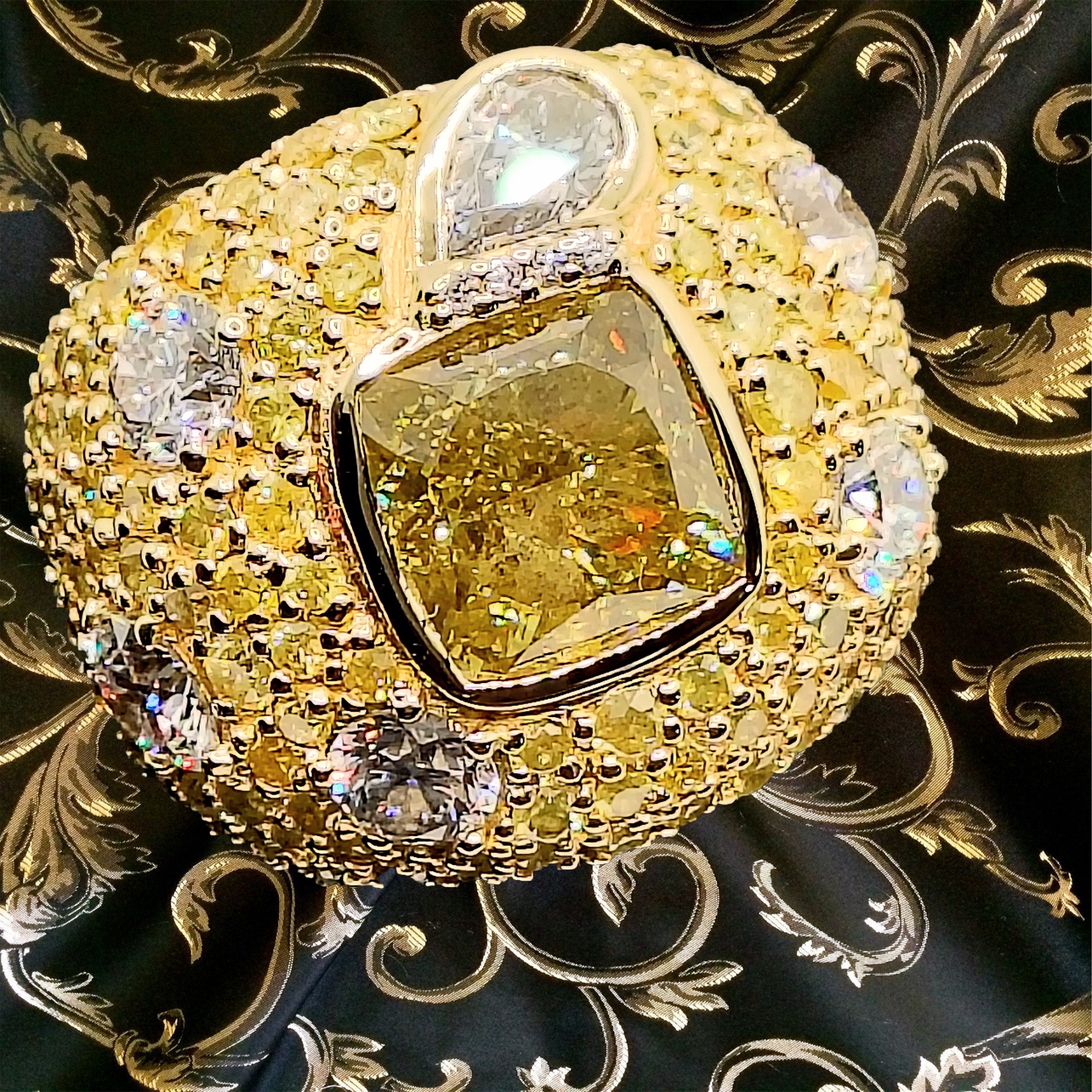 Il diamante centrale, Fancy Yellow, pesa 5,41 carati.